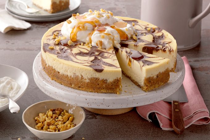 Many cheesecakes, like this tasty brown sugar and chocolate cake and this blueberry swirl cheesecake, rely on swirling the batter with chocolate or jam to create a pretty design. While some of these finishes can look pretty fancy, they’re so simple to accomplish.