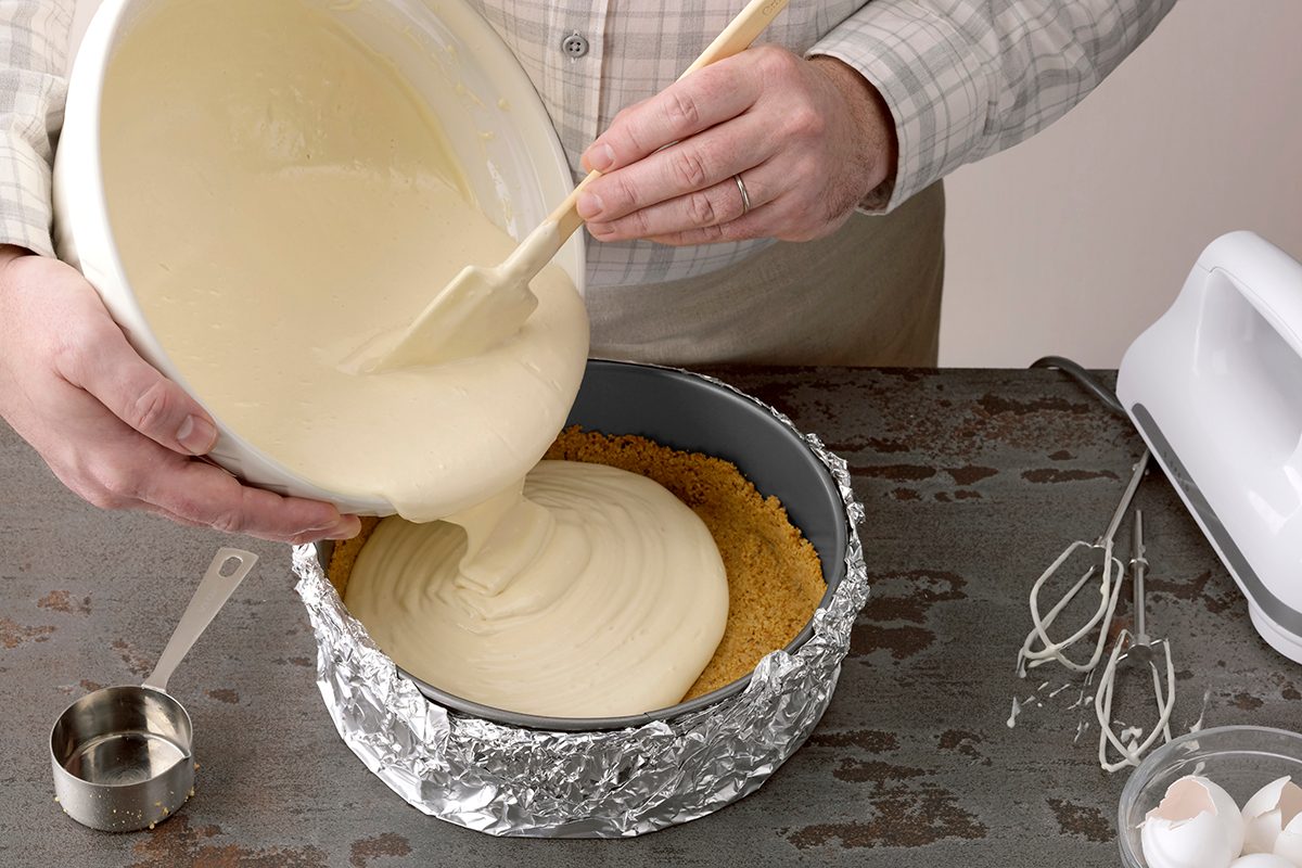 A water bath (or bain-marie if you’re fancy) is a large pan filled with water used to bake delicate recipes like custards and cheesecakes. Using one is easy and it’s a good way to prevent cracked cheesecakes. Even if your recipe doesn’t call for this step, our Test Kitchen recommends it.