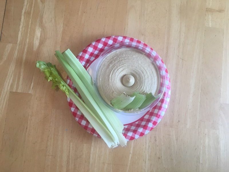 I like to munch on snacks with my two-year-old throughout the day. I usually have a cookie—or cheese and crackers—but since both of those are off-limits when you ditch gluten, I opted for apple slices with peanut butter and celery dipped in hummus for most of the days.