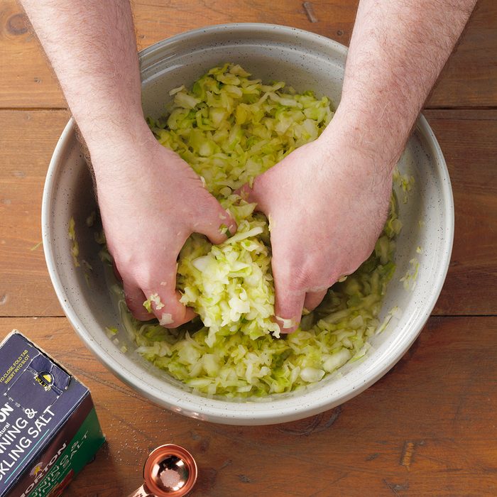 - Quarter cabbages and remove cores; slice 1/8 in. thick. In an extra-large bowl, combine salt and cabbage. With clean hands, squeeze cabbage until it wilts and releases liquid, about 10 minutes. If desired, add optional ingredients.