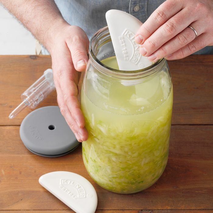 If you have a fermentation kit, it’ll typically come with weights. Press the weights down over the cabbage (the weight should be submerged in the brine) and screw on the top. Follow the guidelines included with your kit.