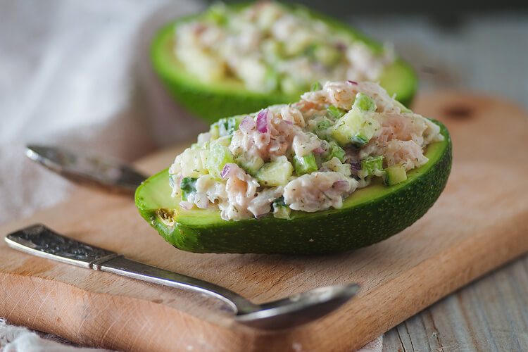 Just because there’s no bread in this recipe doesn’t mean you won’t feel full and satisfied after eating this delicious dish. Fresh seared tuna salad is packed into an avocado bowl, with lemon and Greek yogurt providing a tangy, creamy complement to the fattiness of the avocado.