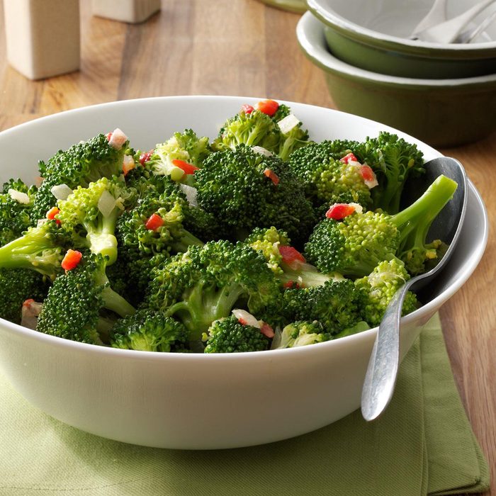From the Recipe Creator: Add a hint of citrus to your vegetables with an attractive side dish. Ideal with most any entree, this time-saving specialty dresses up broccoli, pimientos and onions with a dash of lemon. —Tonya Farmer, Iowa City, Iowa