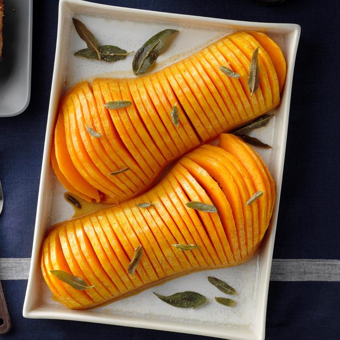 From the Recipe Creator: Squash makes the perfect holiday side dish, especially when it's Hasselback butternut squash! The thin slits cut into each half allow the butter, maple syrup, brown sugar and ground chipotle mixture to get in every single nook and cranny. This is one side that everyone at your holiday table will be excited to gobble up! —Colleen Delawder, Herndon, Virginia