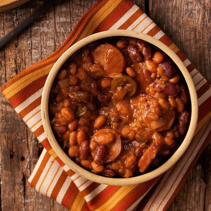 I followed the lead of cooks of the Old Western cattle ranges to come up with these savory beans. Sweet and smoky, they’re made extra hearty by the addition of sausage. —Nancy Moore, Bucklin, Kansas