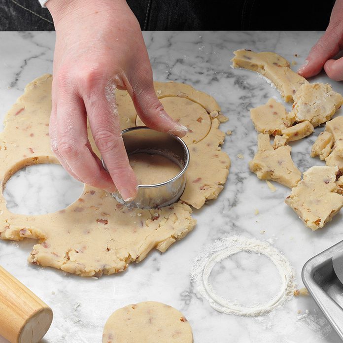 To prevent rerolling the dough more than necessary, try to place your cookie cutters strategically. Place the shapes close together so you minimize scraps.