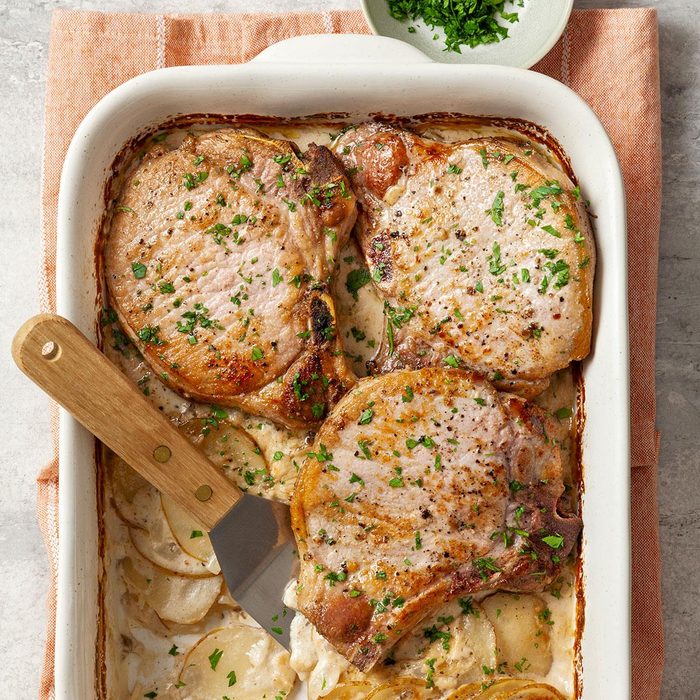 I truly enjoy trying new recipes and baking hearty casseroles like this one for my family. This dish is easy to prepare, and baking the chops with the potatoes gives the whole meal a great flavor. —Susan Chavez, Vancouver, Washington