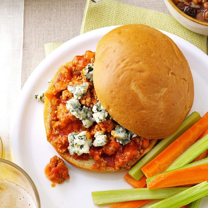 One time when making sloppy joes, I wanted mine spicy, so I doused it in hot sauce. After that, my mind went wild and I made it Buffalo chicken-style with ground chicken, diced celery and blue cheese crumbles. I've been making it this way ever since. —Jennifer Nielson, Spanish Fork, Utah