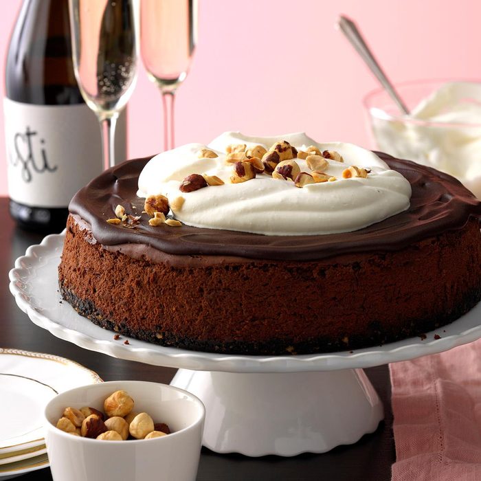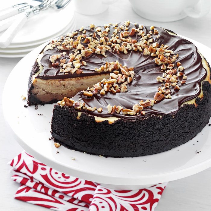 From the Recipe Creator: It’s hard to resist this chocolaty cheesecake with its fudgy crust, crunchy pecans and gooey layer of caramel. I combined several recipes to create this version that satisfies both the chocolate lovers and the cheesecake lovers in my family. —Brenda Ruse, Truro, Nova Scotia