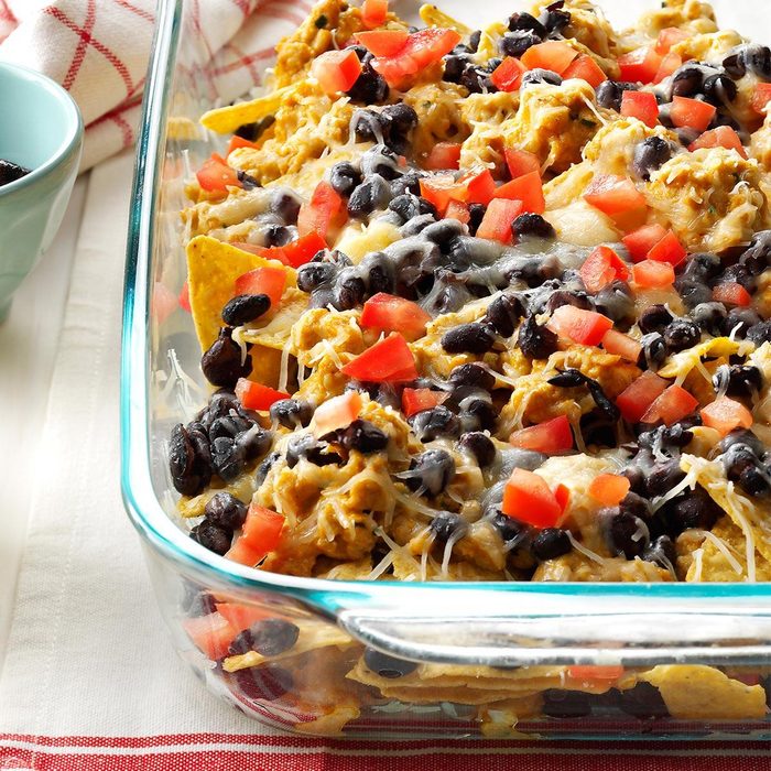 What's game day without can't-stop-munching nachos? Featuring layers of crunchy tortilla chips, black beans and a creamy, smoky chicken mixture, this appetizer will disappear before the second quarter. —Whitney Smith, Winterhen, Florida