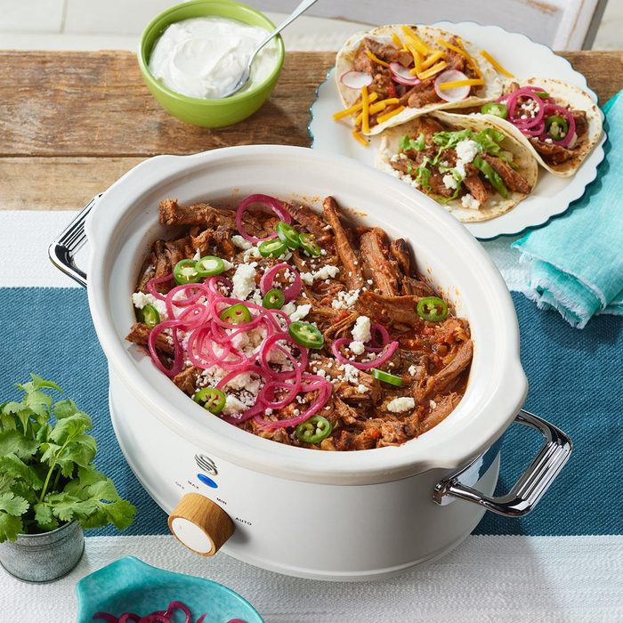 Make your next office party a taco bar or burrito bar! Set out the beef in the slow cooker on warm, along with tortillas, bowls of shredded cheese, salsa, sour cream, and chopped lettuce, jalapenos, onions and tomatoes. For a variation, I make Beef & Bean burritos by mixing a can of refried beans into 3 or 4 cups of cooked beef filling. —Hope Wasylenki, Gahanna, Ohio