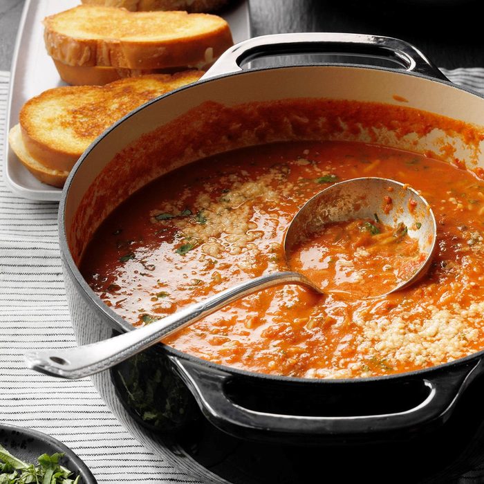 After craving tomato soup, I decided to make my own. My sister Joan likes it chunky-style, so she doesn't puree. Serve it with a grilled cheese sandwich. —Marian Brown, Mississauga, Ontario