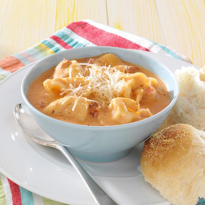 We adore everything pasta, so I used it as the inspiration for this unique soup. The meaty tomato base pairs perfectly with the cheesy ravioli pillows. My family can't get enough of this dish! —Shelley Way, Cheyenne, Wyoming