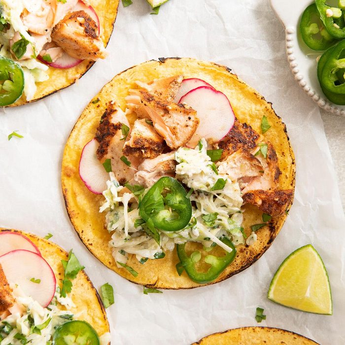 You can have a restaurant-style dinner in less than 30 minutes with these easy salmon tacos. In addition to the zesty coleslaw, add your favorite toppings like sliced avocado, radishes or jalapeno peppers. —Taste of Home Test Kitchen