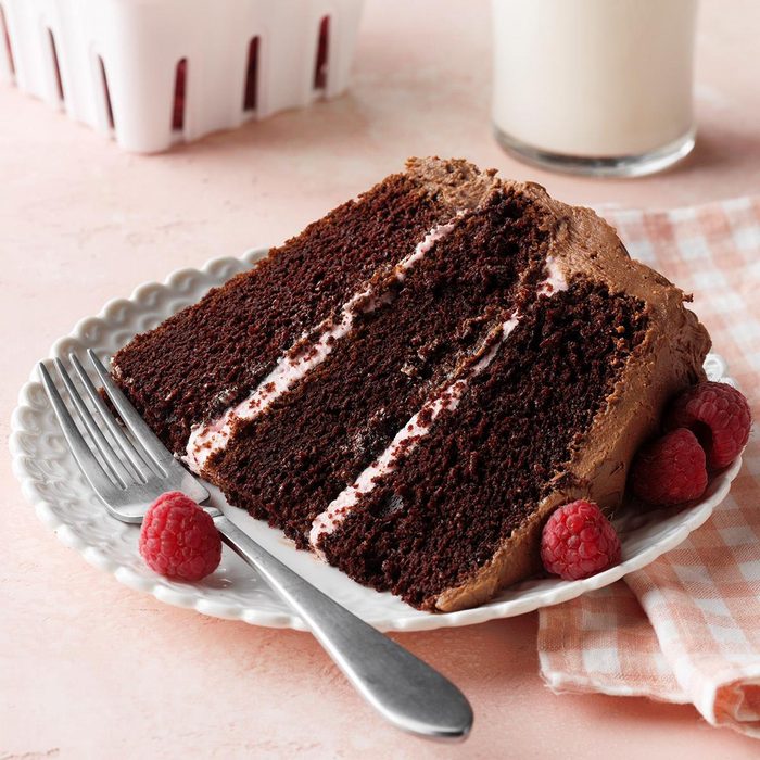 Whenever I make this chocolate raspberry cake, I get rave reviews. It’s impressive, and the raspberry filling is wonderful. —Marlene Sanders, Paradise, Texas