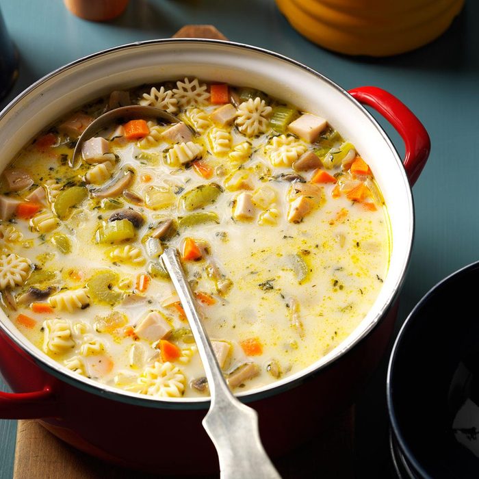 For a creamy turkey soup with a sense of fun, we go wheels up at our house. We load it up with wagon-shaped pasta and veggies. —Nancy Beyer, Hayden Lake, Idaho