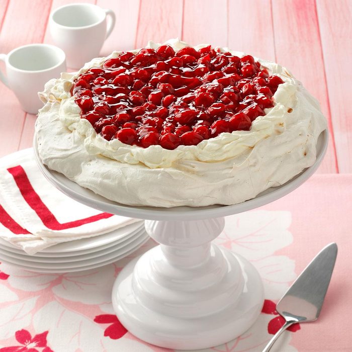From the Recipe Creator: Our Amish friend Naomi Yoder makes this meringue heart topped with cream cheese and pie filling whenever we visit. Her family’s farm is a stop on our wagon train vacation. —Judy Herbkersman, Collins, Ohio