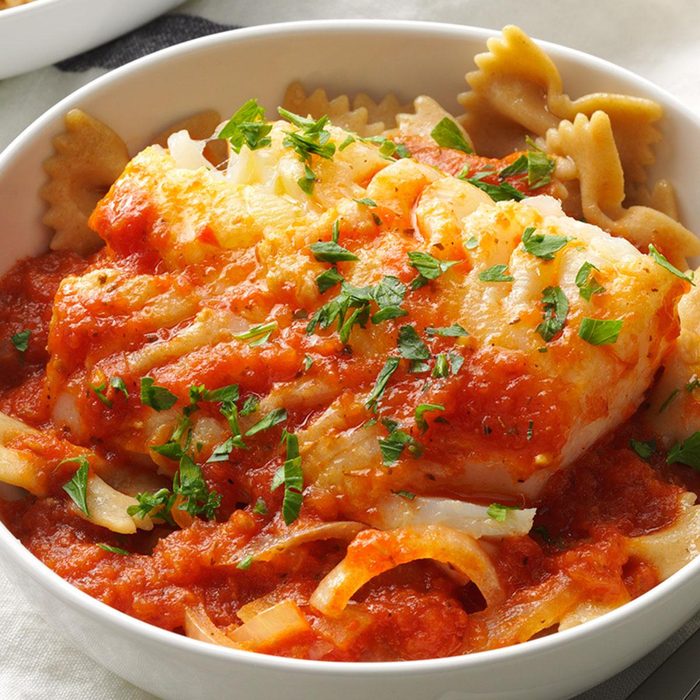 1 fillet with 3/4 cup sauce: 271 calories, 8g fat (1g saturated fat), 65mg cholesterol, 746mg sodium, 17g carbohydrate (9g sugars, 4g fiber), 29g protein. Diabetic Exchanges: 3 lean meat, 2 vegetable, 1-1/2 fat.