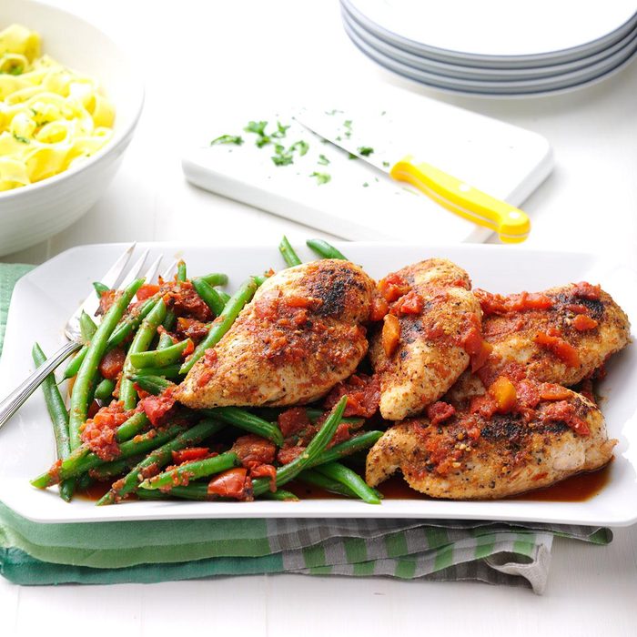 My skillet chicken with the colors and flavors of Italy is so easy. The fire-roasted tomatoes sound complicated, but all you have to do is open a can! —Margaret Wilson, Sun City, California