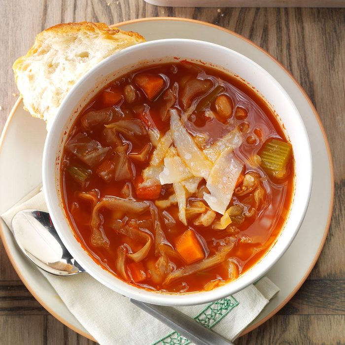 After doing yard work on a windy day, we love to come in for a light but hearty soup like this one. It’s brimming with cabbage, veggies and white beans. Pass the oven-warmed bread! —Jennifer Stowell, Deep River, Iowa
