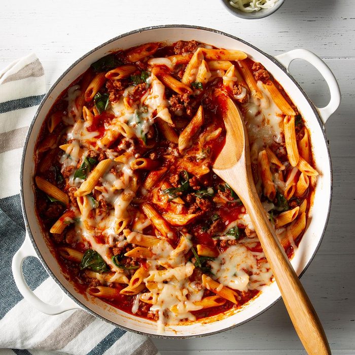 This hearty penne beef recipe is comfort food at its finest! The best of everything is found here—it’s tasty, easy and a smart way to sneak in some spinach for extra nutrition. —Taste of Home Test Kitchen