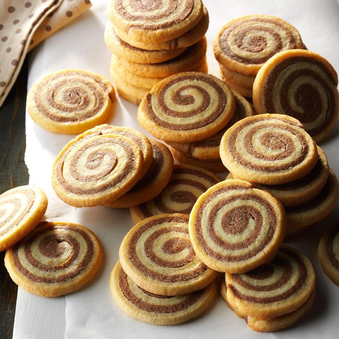 Don’t let the fancy-looking spiral shape dissaude you—they’re easier to make then you’d think. Roll out each layer with a rolling pin, then tightly roll both layers together, jelly-roll style, to create the classic look.