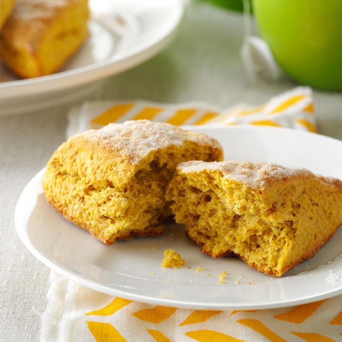 I made these lovely scones one day when looking for a way to use up leftover pumpkin, and I was so excited with the results. I often use my food processor to stir up the dough just until it comes together. It's so simple to prepare this way. —Brenda Jackson, Garden City, Kansas