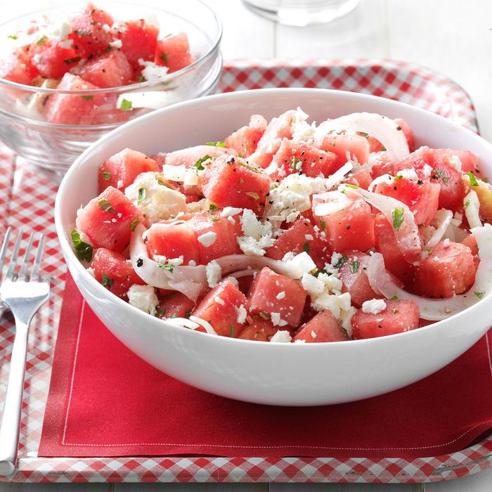 The refreshing blend of watermelon, red onions and a splash of citrus always does me proud at picnics and potlucks. I like to prepare it a day ahead so the flavors have a chance to blend, and I use the rind as a colorful serving bowl. If you're short on time, simply substitute any bottled citrus vinaigrette. —Alisha Duncan, Blanchard, Oklahoma