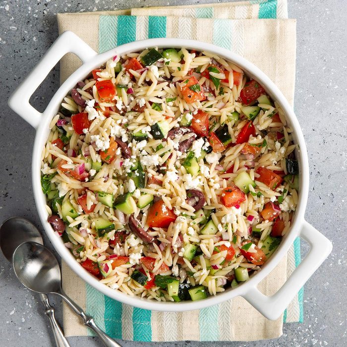 Pasta salads are a forever favorite at summer gatherings and barbecues, and this Greek orzo salad ranks right up there with the best of them. Cooked orzo is tossed with tangy feta, crisp cucumbers, juicy tomatoes, briny olives and a zesty dressing, but the best part is, it gets even better as it sits in its marinating juices. While vegetarian, you could add marinated chicken skewers or gyro meatloaf to transform this side dish into an entrée for your whole family.