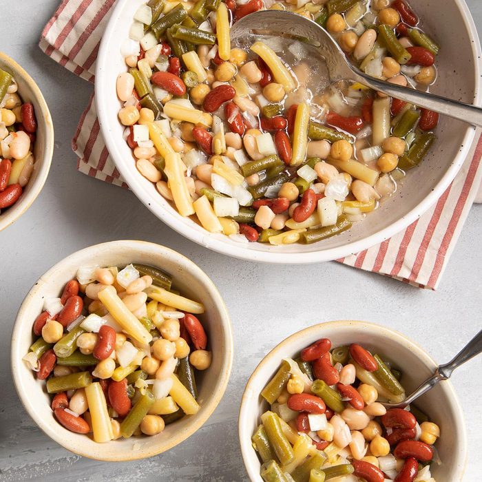 From the Recipe Creator: Combine five kinds of beans with an oil-and-vinegar dressing in this colorful classic that’s great to take to picnics or potluck. Everyone loves the variety of beans in this simple salad and my husband, Chuck, just can’t get enough of it. —Jeanette Simec, Ottawa, Illinois