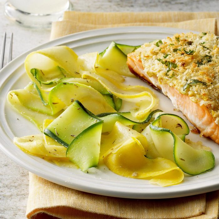 Steamed and well seasoned, these pretty vegetable ribbons will dress up your dinner plate. The strips of yellow summer squash and zucchini are easy to cut using a vegetable peeler or cheese slicer. —Taste of Home Test Kitchen, Milwaukee, Wisconsin