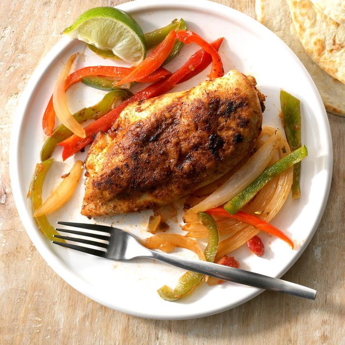 This quick and healthy chicken and peppers recipe tastes like a naked taco and is bursting with fresh flavors. And it can all be prepared in the same pan for easy cleanup—it’s a win-win! —Doris Heath, Franklin, North Carolina