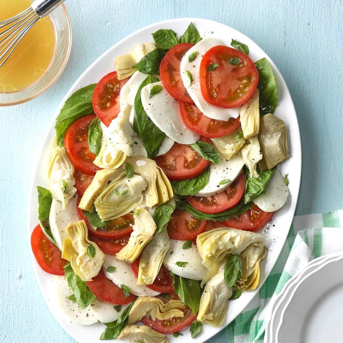 I dressed up the classic Italian trio of mozzarella, tomatoes and basil with marinated artichokes. It looks so yummy on a pretty platter set out on a buffet. Using fresh mozzarella is the key to its great taste. —Margaret Wilson, San Bernardino, California
