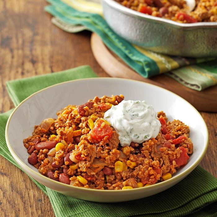Since I’m especially busy with three active teenagers, I don’t have much time to get dinner on the table in the evening. Instead, I rely on quick options, like this one-skillet dish that boasts essential proteins, veggies and good carbohydrates. —Julie Peterson, Crofton, Maryland