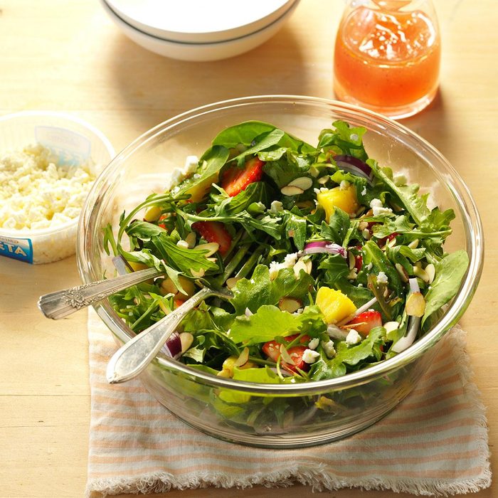 When I take this cheery mix of berries, pineapple, red onion and feta to book club, it’s a blockbuster. I add a sprinkle of vanilla sugar almonds on top. —Deborah Loop, Clinton Township, Michigan