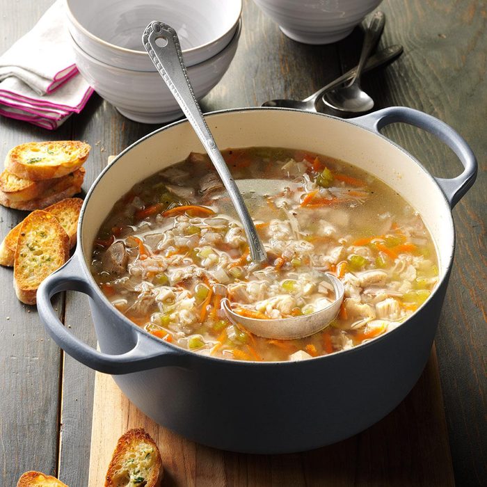 From the Recipe Creator: My daughter got this recipe from her husband’s mother. As in many households, our turkey gets picked over for a few days after the holidays. This soup is especially good on cold winter nights when it’s snowing…which happens a lot where I live! —Carol Brethauer, Denver, Colorado
