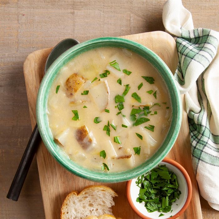 From the Recipe Creator: My family and I love a steaming bowl of potato leek soup on a cold winter evening, but we don’t love the butter and fat content of regular soup recipes. So I created this lighter version. I have shared it with many folks, and everyone who has tried it loves it for the robust, satisfying flavor. —Christine Frye, Odessa, Missouri