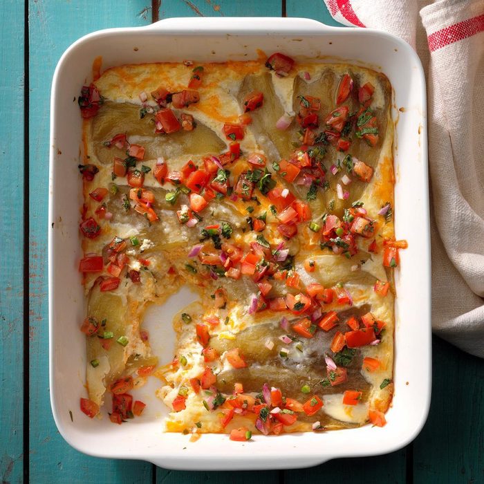 Chiles rellenos translates to stuffed peppers. It’s usually a green chile pepper stuffed with meat and an egg batter. This layered dish combines those same elements with a cheesy, Monterey Jack surprise.