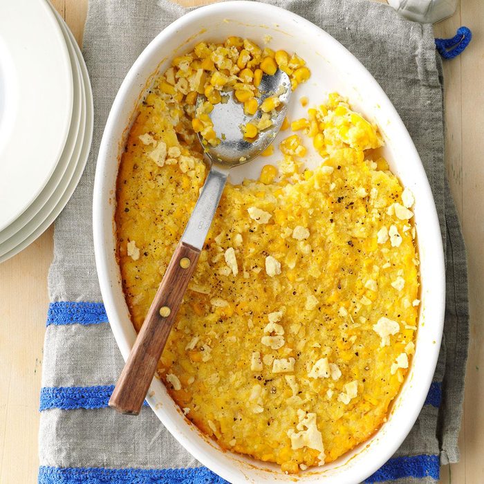 The corn in this casserole is tucked into a creamy custard. It’s a family favorite that gets served up often.