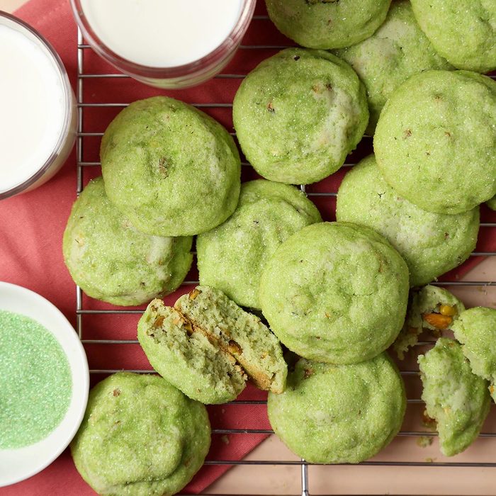 These green-colored cookies are festive enough for any St. Patrick’s Day party. A few drops of green food coloring and instant pistachio pudding mix create their vibrant color.
