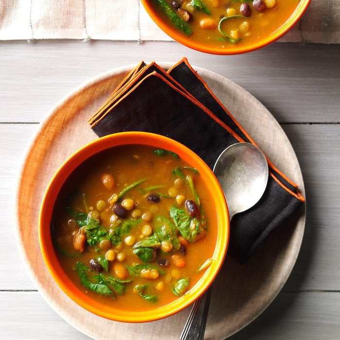 Lentil lovers will want a second bowl of this nourishing soup with a subtle touch of curry. It looks particularly appealing thanks to the color added by the fresh spinach. —Kim Russell, North Wales, Pennsylvania