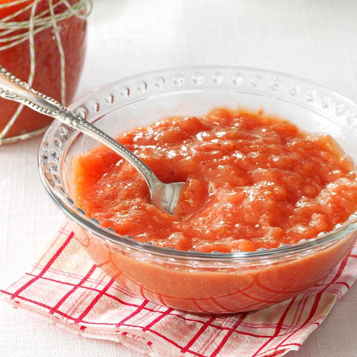 I always end up with lots of rhubarb each summer, but many of the recipes use a lot of sugar. This one lets the fruit sweeten up the rhubarb instead. I refrigerate the sauce overnight to help the flavors blend. —Amy Nelson, Weston, Wisconsin