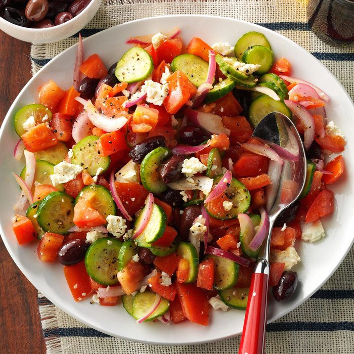 From the Recipe Creator: The heart of a Greek salad recipe is in the olives, feta, cucumbers and tomatoes. Dress it with olive oil and vinegar, then add more olives and cheese. —Arge Salvatori, Little Ferry, New Jersey