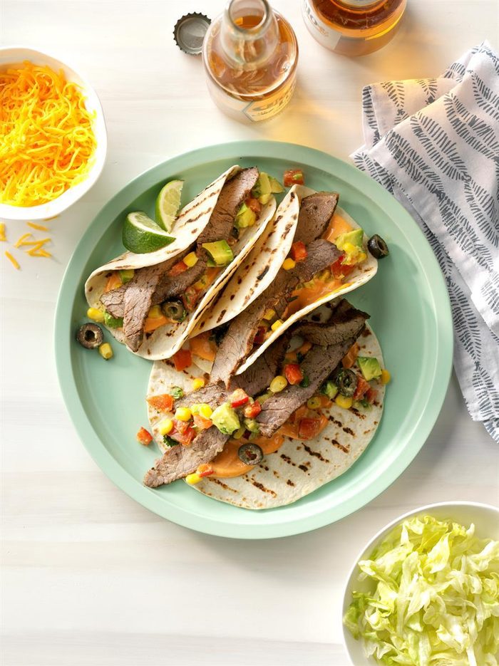 You’ll want extra spicy aioli and avocado-corn salsa for these grilled ribeye tacos. Heat the flour tortillas on the grill for a charred flavor, but be careful, they puff up fast!