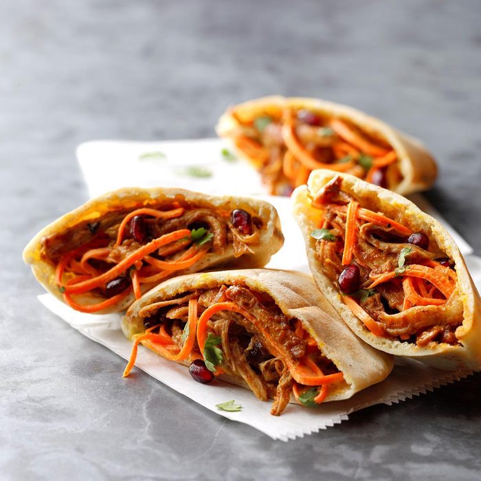 From the Recipe Creator: I enjoy shredded chicken dishes, pita sandwiches and Moroccan seasonings. The addition of the carrot salad laced pomegranate seeds and with dates lends an extra punch and crunch. Mini flour tortillas can be substituted for pitas. —Arlene Erlbach, Morton Grove, Illinois