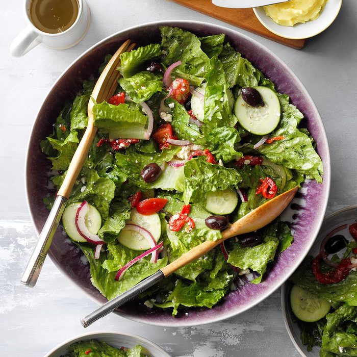 Got a crowd coming over for a backyard barbecue? This crisp, big-batch Mediterranean salad recipe makes a great accompaniment to any main dish you fix on the grill. —Pat Stevens, Granbury, Texas