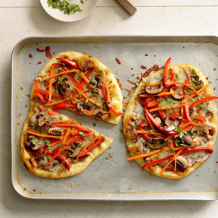 I'm a huge fan of Thai food, but don't always have the time to make it at home. To get my fix, I top fluffy naan bread with a ginger-peanut sauce, fresh veggies, a sprinkle of cilantro and a spicy squiggle of Sriracha. —Rachel Seis, Taste of Home Senior Editor