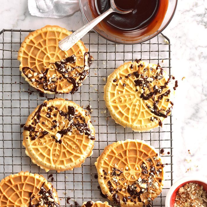 If you love fun baking gadgets, you'll enjoy making these crispy, almond-flavored cookies, which get their unique waffle design from a pizzelle maker. They bake up golden brown in only a few minutes. Feel free to double the chocolate drizzle if you'd like to cover the cookies more generously. —Hannah Riley, Norwalk, Ohio