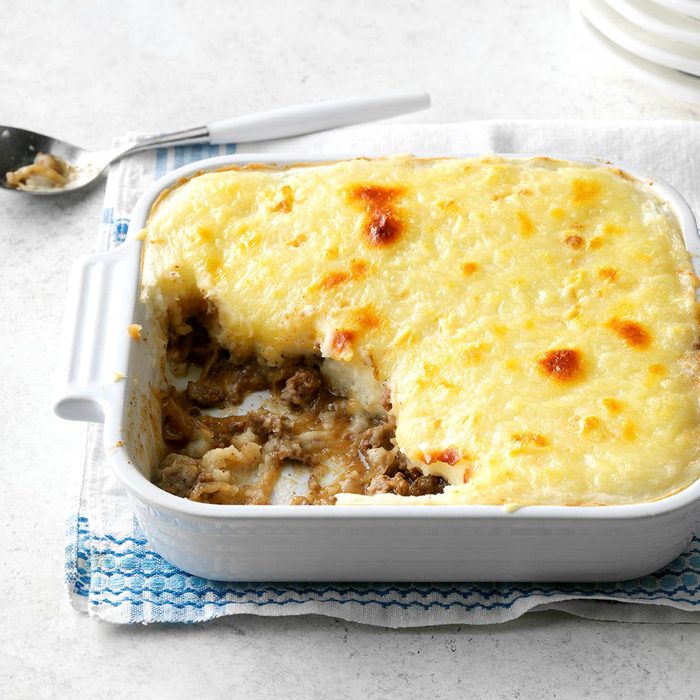 This hearty casserole has all the rich flavor of the French onion soup my family loves. The combination of the cheese-topped mashed potatoes and savory beef and onions is ideal for an autumn dinner. It doubles and freezes easily, so make one to eat tonight, and one for the freezer for later.—Jennifer Beckman, Falls Church, Virginia