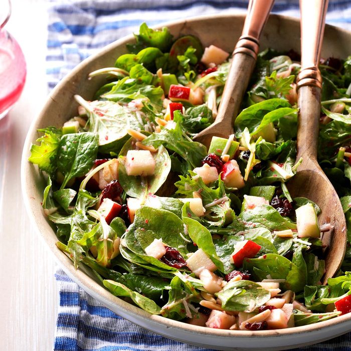 Dried cranberries, crunchy apple chunks and toasted almonds dress up this crisp green salad. It’s drizzled with a sweet-tart dressing that’s a snap to blend. —Taste of Home Test Kitchen, Milwaukee, Wisconsin